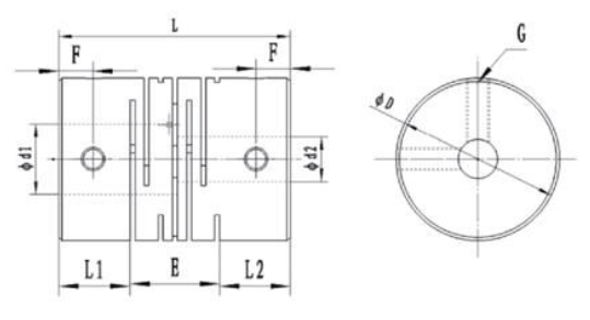| Modell | d1 (min) | d2 (max) | øD | L | L1/L2 | E | F | G | M | N.M | Nominális nyomaték (N.m) |