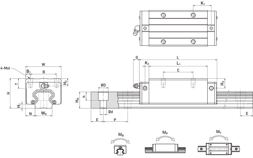 | H | H1 | N | W | B | B1 | C | L1 | L | K1 | K2 | G | M*l | T | H2 | H3 | WR | HR | øD | h | ød | P | E | (mm) | C(KN) | Co(KN) | MR KN-m | MP KN-m | MY KN-m | kg | kg/m | |||